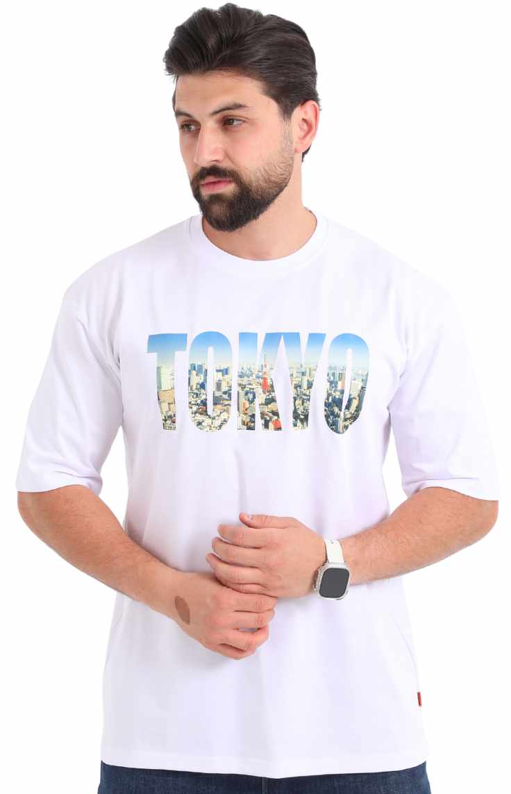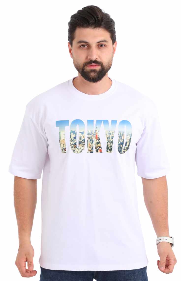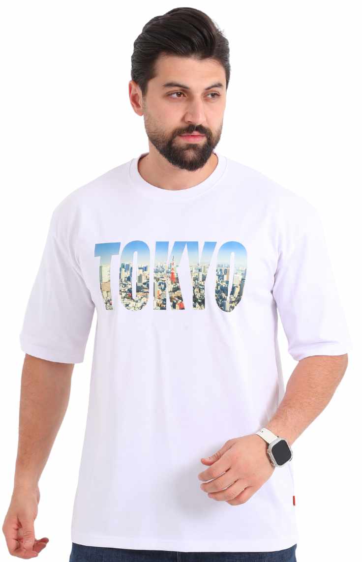 تيشيرت طوكيو بوليفار الأبيض اوفر سايز مصنوع للرجال الذين يحبون الإطلالات الجريئة مع الراحة.